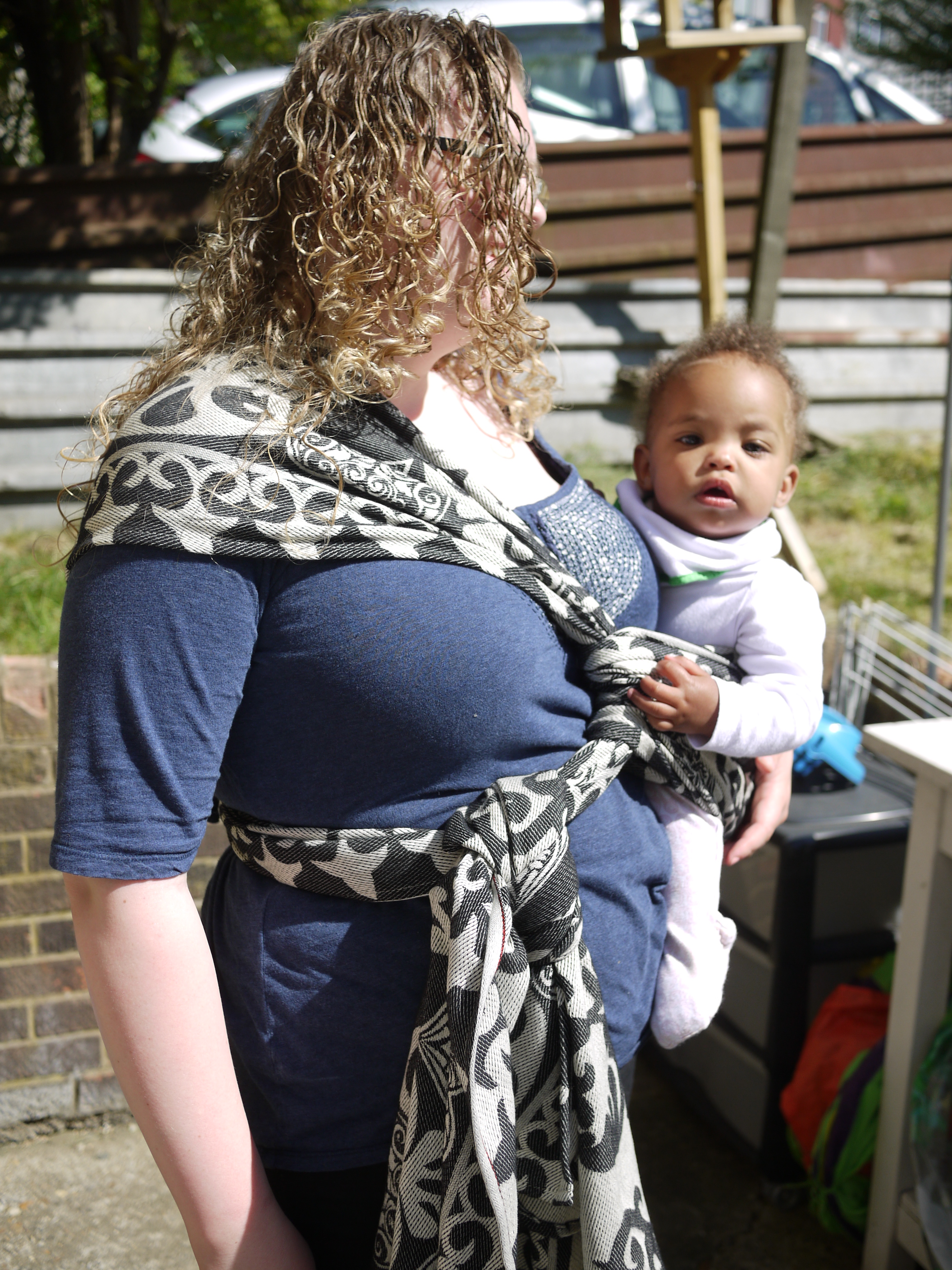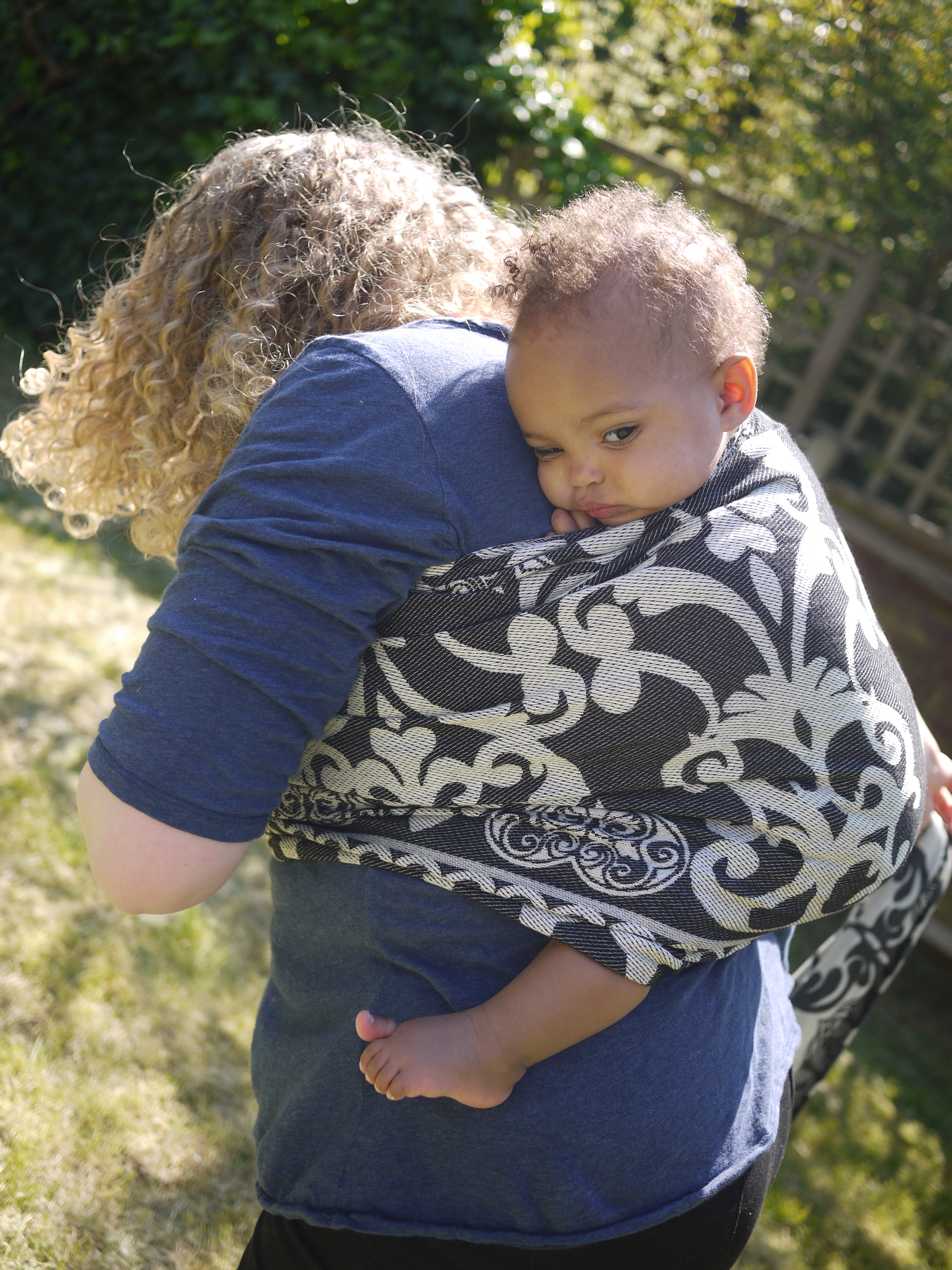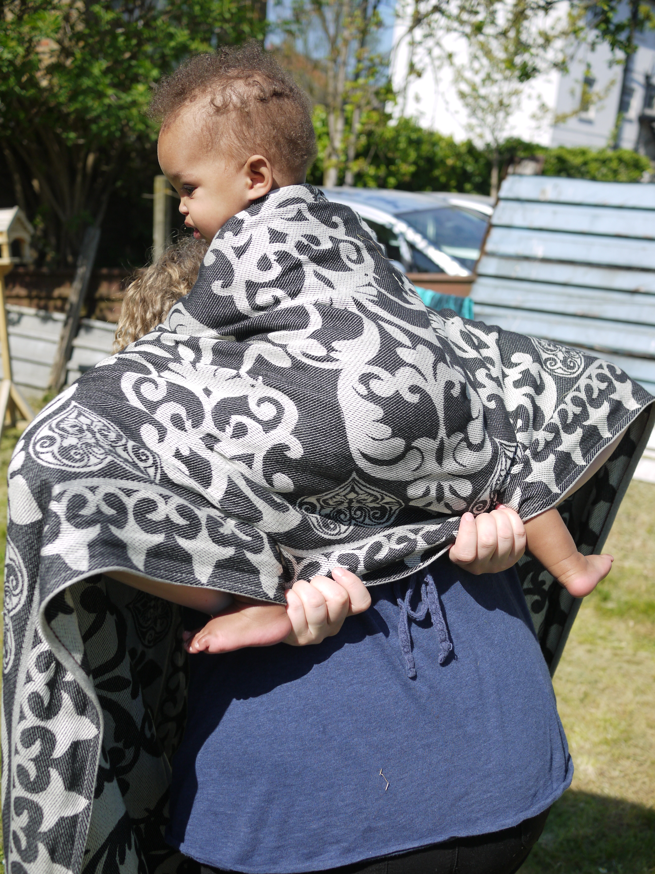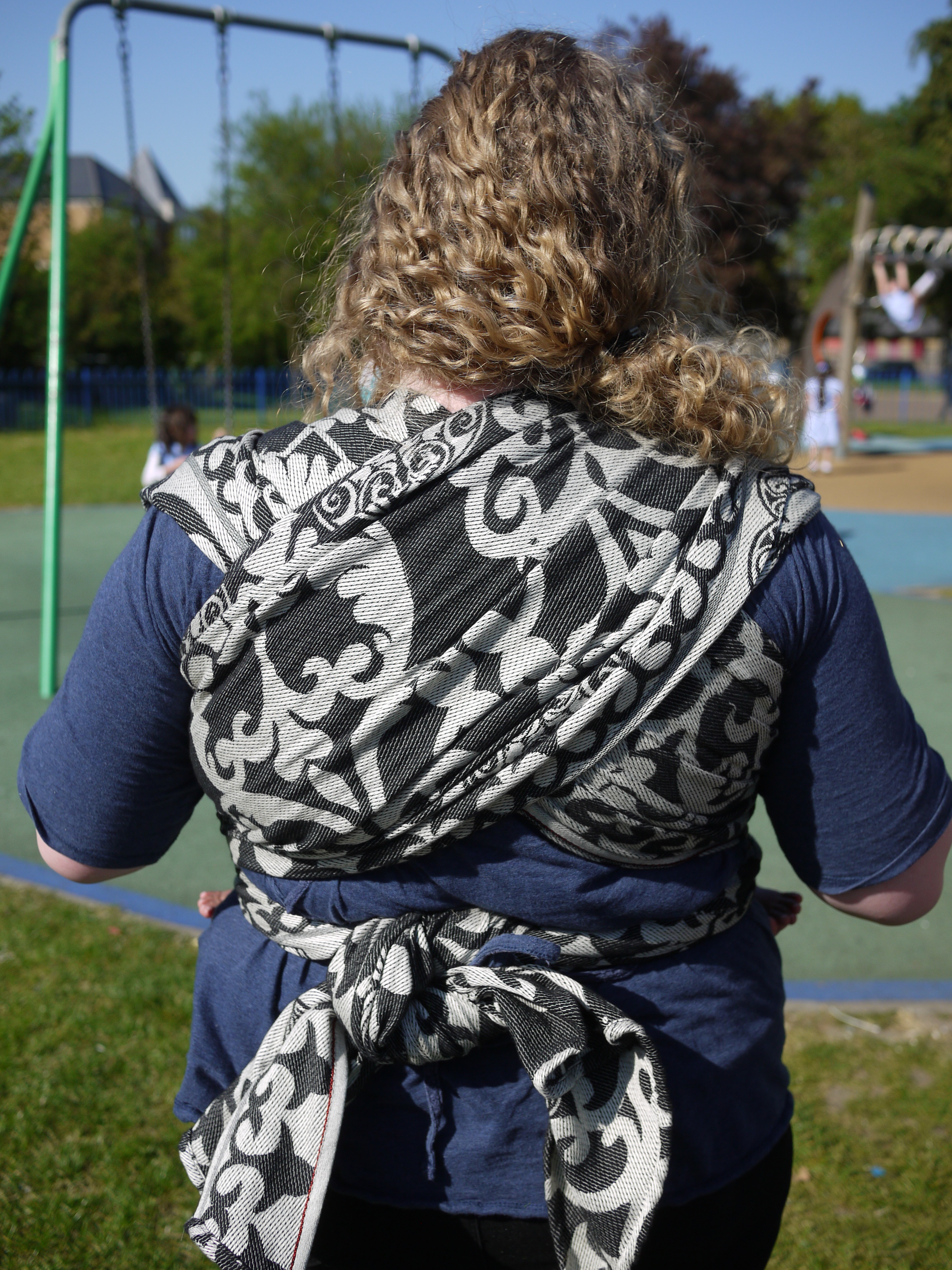 I spent most of a whole day in the wrap and it never felt diggy or uncomfortable, we walked for about an hour around West London before stopping in the park where I received admiring looks. The FWCC stayed fixed, nice and snug continually. And even a re-tie in the park with an audience was easy because the wrap is just so good and makes wrapping a real pleasure.