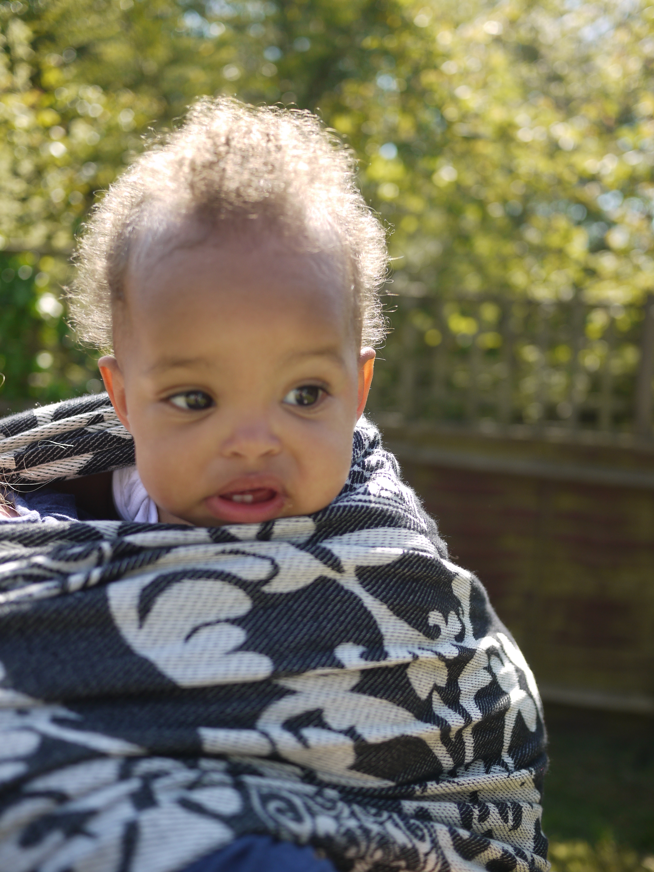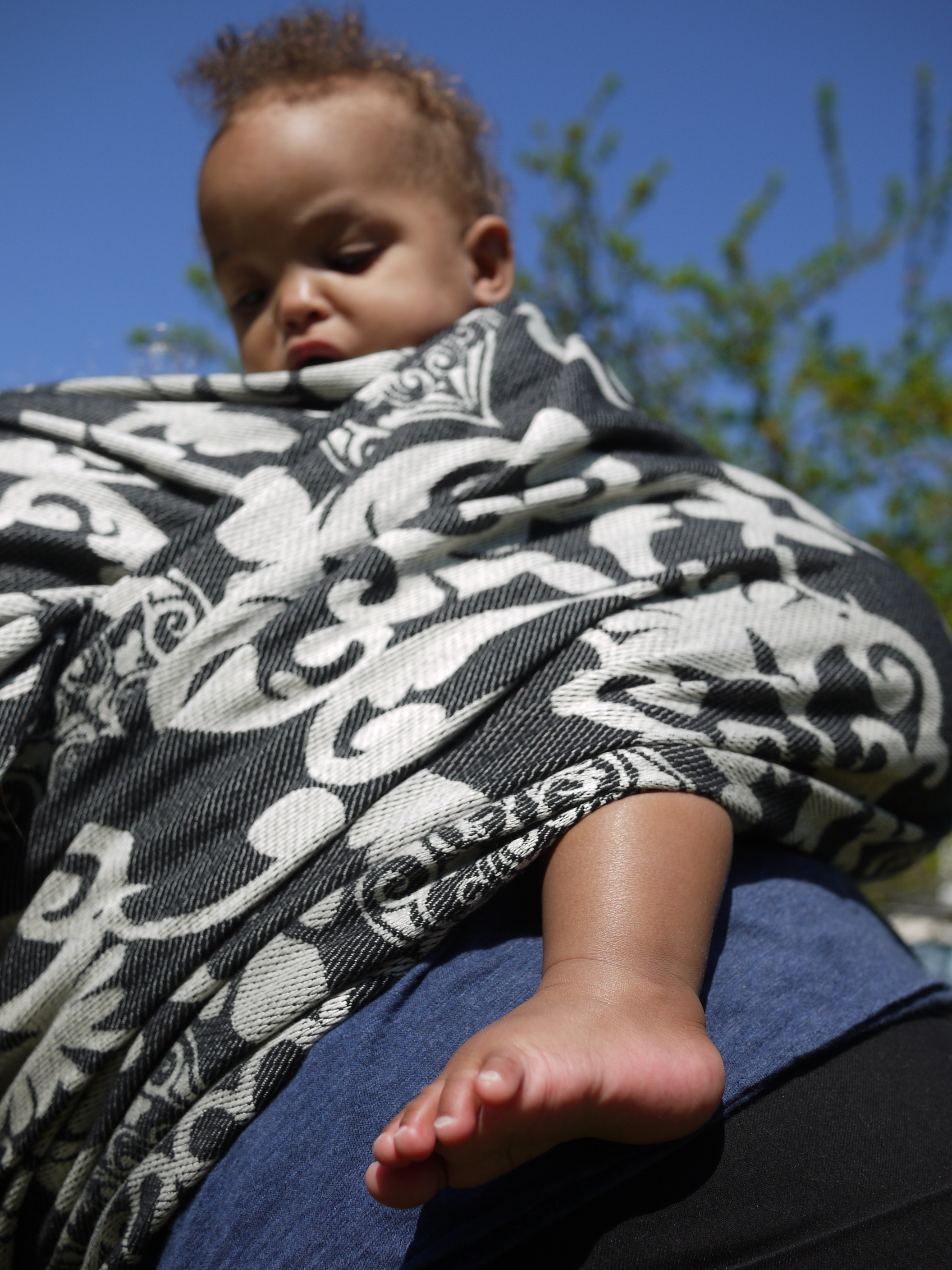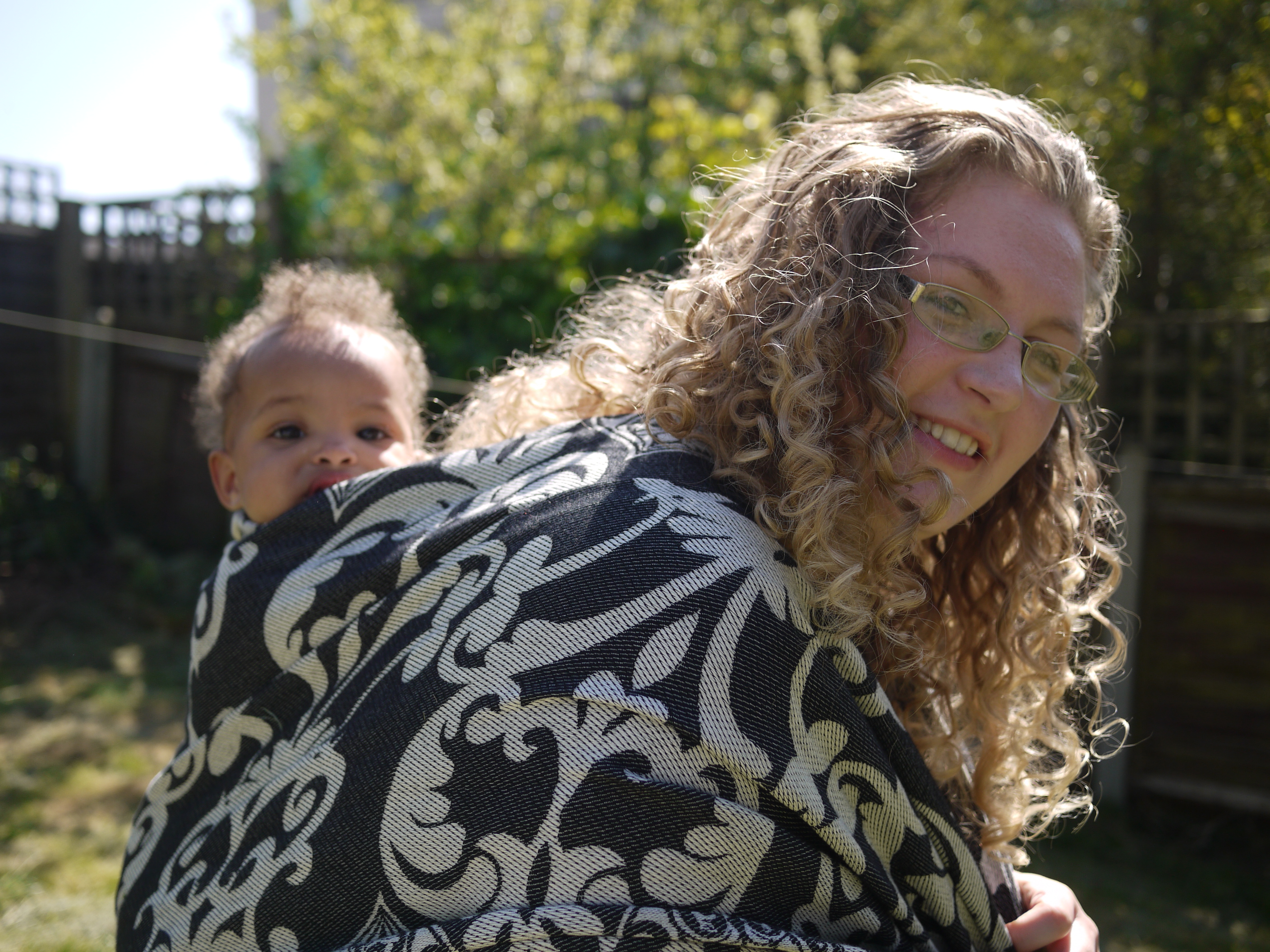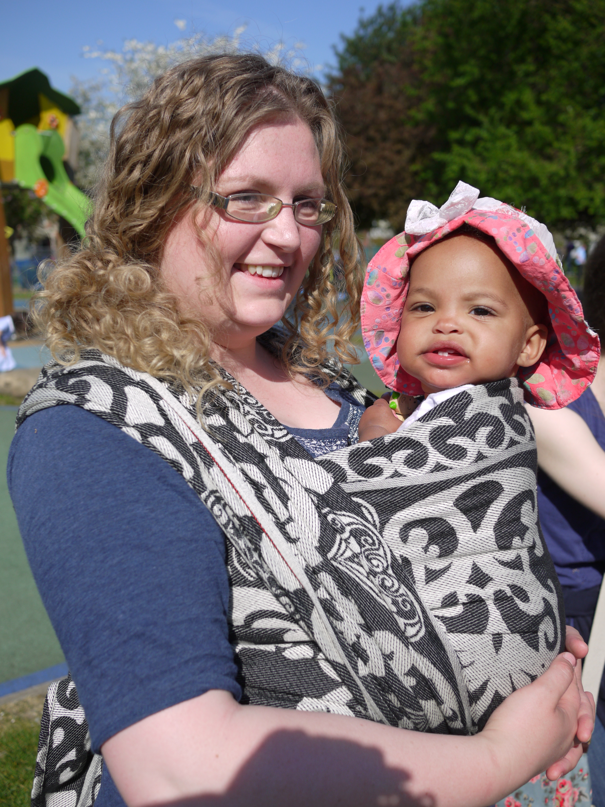 I spent most of a whole day in the wrap and it never felt diggy or uncomfortable, we walked for about an hour around West London before stopping in the park where I received admiring looks. The FWCC stayed fixed, nice and snug continually. And even a re-tie in the park with an audience was easy because the wrap is just so good and makes wrapping a real pleasure.